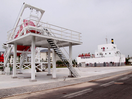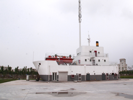 高消实训场地内有模拟船舶一艘,内部配有各种消防设备,如大型CO2系统、大型干粉灭火系统、泡沫灭火系统和应急消防系统等,可进行实际操作,满足高级消防实训要求。同时甲板上装有系离泊设备、锚泊设备,可进行系缆、解缆和锚泊作业。LPG系统可以完成装卸货作业,IGS系统可以完成洗舱作业。此外救生艇实训场地拥有先进救生艇5艘,可以满足救生艇释放与回收的训练,针对PSC检查项目进行实际训练和操作。