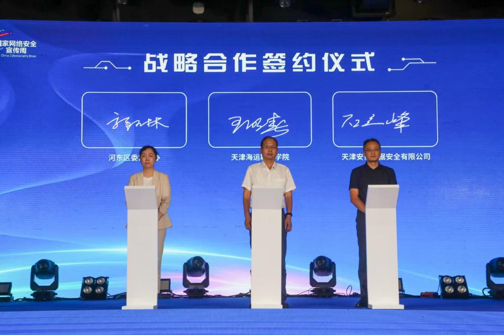 启动仪式上,王明春副院长代表学院,与中共天津市河东区委网信办主任郭琳、天津安恒数据安全有限公司总经理石立峰,共同签署了政校企三方战略合作协议。协议的签署,标志着三方将深度融合政策资源、教育资源与技术产业优势,共建“网络安全人才培养基地”,协同开展政策宣贯、科普教育、技术研发与人才联合培养等工作,为助力天津市及河东区数字经济高质量发展筑牢安全基石。