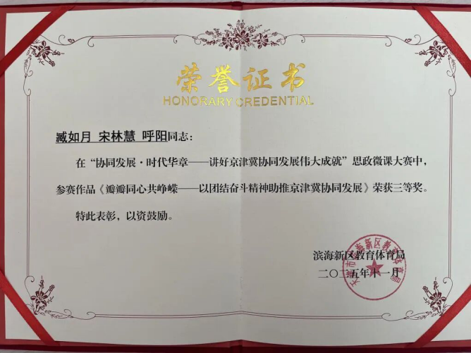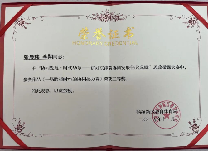 近日,由天津市滨海新区教育体育局、京津冀大中小学沉浸式集体备课协作共同体主办的“协同发展·时代华章——讲好京津冀协同发展伟大成就”思政微课大赛获奖名单正式公布,学院两支思政教师团队凭借优质教学设计与生动实践表达,双双荣获三等奖。