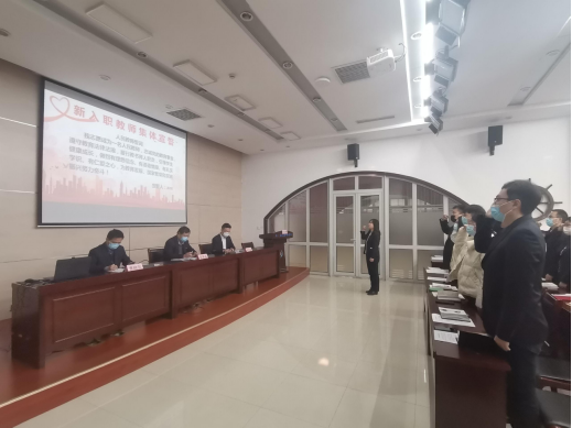2022年1月5日上午,学院举行了新入职教师宣誓仪式暨岗前培训结业式。党委书记张建成,党委副书记、院长吴宗保,党委副书记曹晓发,相关部门及教学系部党政领导出席会议。仪式由干部人事处(党委教师工作部)处长杨桦主持。