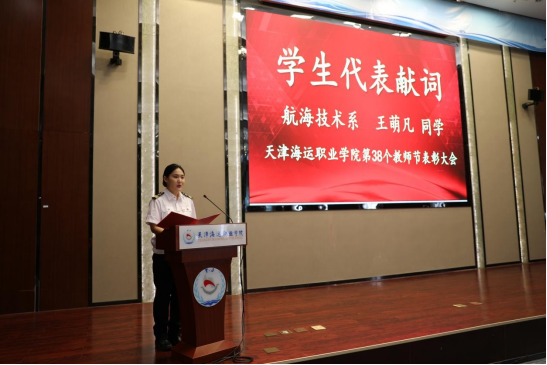 航海技术系王萌凡同学作为学生代表向教师们献词。她讲述了在学习、返校、就业、生活中老师们给予的无私陪伴,帮助和教育。这些点点滴滴无时无刻不在滋润着学生们的心灵,渗透在学生们的日常生活之中。