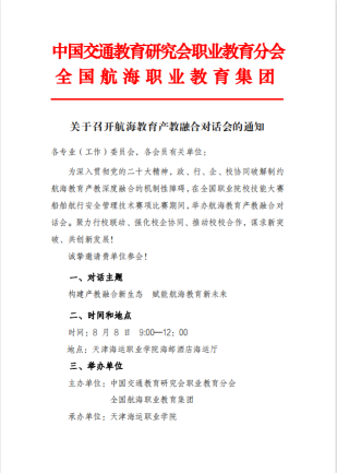 为深入贯彻党的二十大精神,政、行、企、校协同破解制约航海教育产教深度融合的机制性障碍,由中国交通教育研究会职业教育分会和全国航海职业教育集团主办,天津海运职业学院承办的航海教育产教融合对话会,将于8月8日在全国职业院校技能大赛船舶航行安全管理技术赛项比赛期间召开。
