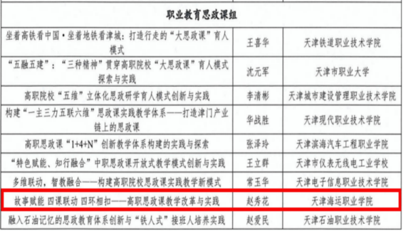 近日,市教育科学规划领导小组办公室公布天津市教学成果奖重点培育项目(思政专项)立项结果,思政教学部赵秀花教师团队申报的《故事赋能四课联动四环相扣——高职思政课教学改革与实践》从35项申报项目中脱颖而出,获批立项。