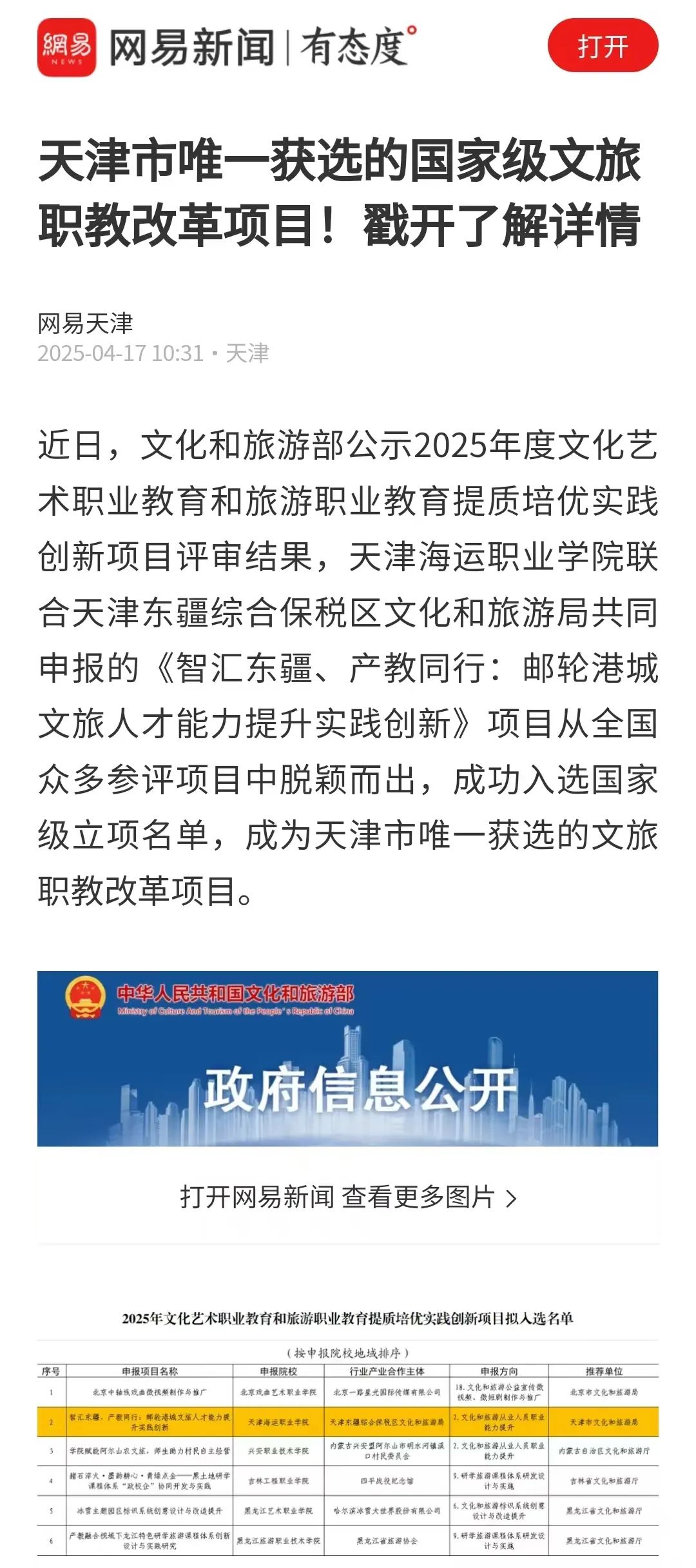近日,文化和旅游部公示2025年度文化艺术职业教育和旅游职业教育提质培优实践创新项目评审结果,天津海运职业学院联合天津东疆综合保税区文化和旅游局共同申报的《智汇东疆、产教同行:邮轮港城文旅人才能力提升实践创新》项目成功入选,成为天津市唯一获选的文旅职教改革项目。网易新闻对此进行了报道。