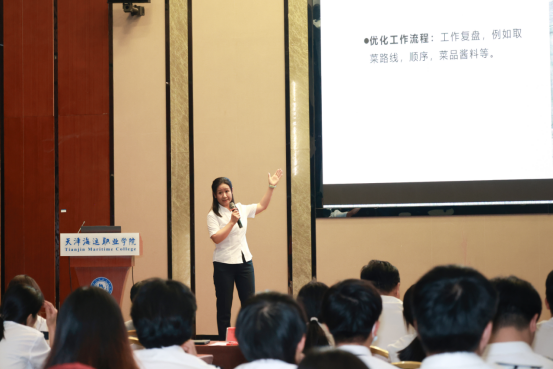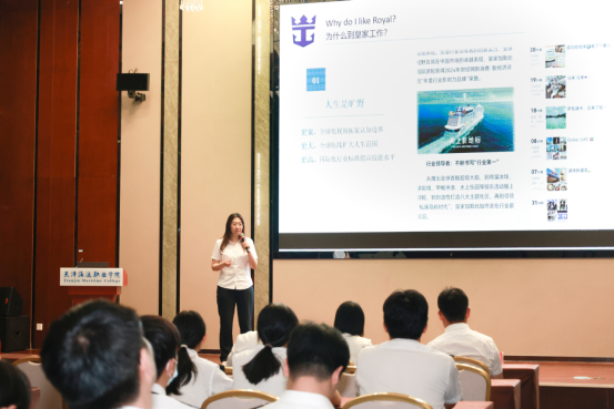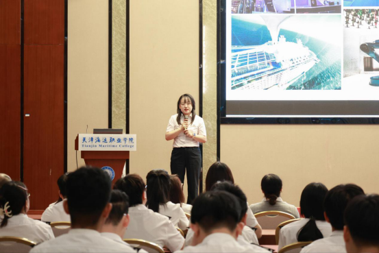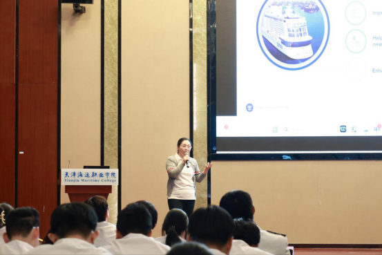 皇家加勒比集团全球市场招聘官Miranda女士为订单班学生带来"启航预备课",讲解国际邮轮人才标准与职业发展通道、入职前专业技能提升要点、跨文化工作环境适应策略。学生程欣钰表示:"这次活动让我们对未来的工作场景有了直观认识,明确了专业技能提升方向,对即将开始的职业生涯充满期待。"