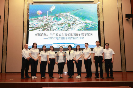 在专业教师培训成果的分享环中,邮轮旅游系10名参加培训的教师通过“甲板即课堂”的创新视角,系统呈现了在"海洋赞礼号"上的培训收获。培训分享内容涵盖:“邮轮职场全景解析",包括海上工作环境认知、24小时船员生活管理等内容;"邮轮服务教学创新",分享如何将真实工作场景转化为教学案例;"职业能力进阶路径",详细解读从合格到优秀的岗位发展轨迹。参训教师谢君表示,“本次登船实训实现了教学空间从教室到甲板的延伸,为构建'无界化'邮轮专业教学模式提供了宝贵经验。此次培训后教师能够将行业最新标准融入教学,助力学生职业成长。”