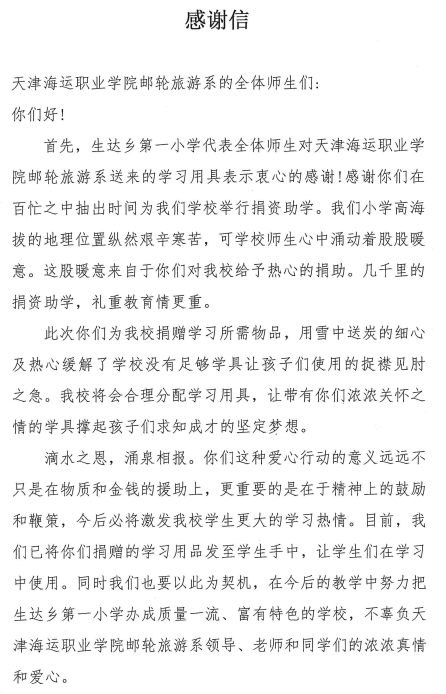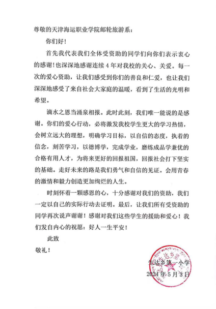 年复一年的涓滴汇聚,早已超越了单纯的物质馈赠。它生动诠释了邮轮旅游系立德树人、服务社会的深厚情怀,是学院资助育人工作最温暖、最持久的注脚。这份源自校园、播撒高原的深情厚谊,在孩子们心中种下了感恩与奋进的种子,也在师生心中刻下了责任与担当的印记。它架起了一座无形的桥梁,连接着内地与高原,传递着知识、希望与民族团结的深情,默默滋养着祖国的未来,温暖了千里之外的雪域求学路。