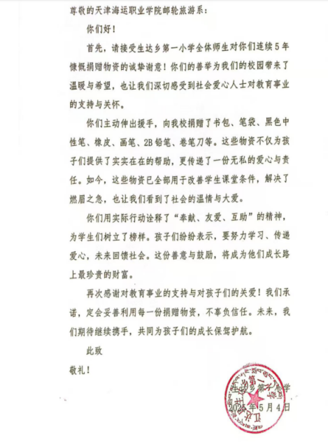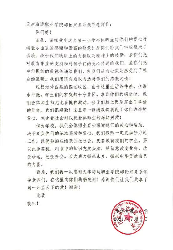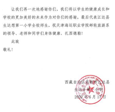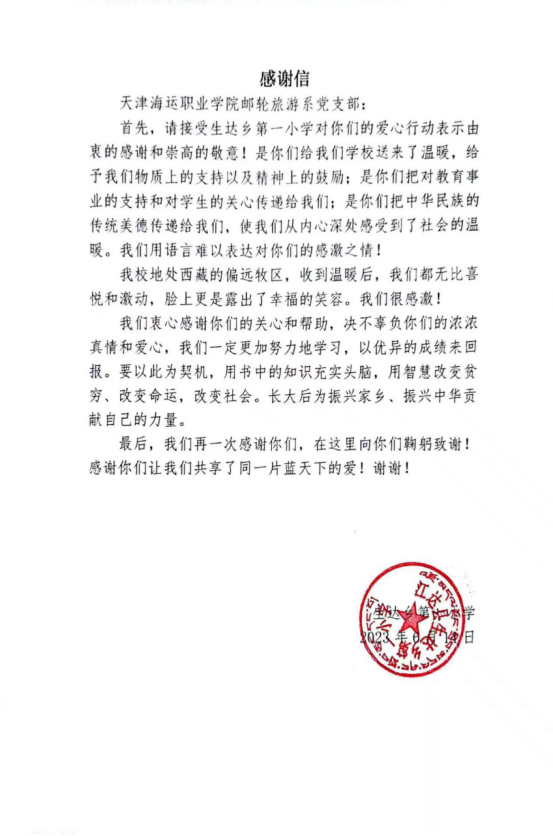 寒来暑往,五载春秋。一份源自邮轮旅游系全体师生的深情牵挂,跨越三千公里的壮阔山河,飞越四千米海拔的巍巍雪域,年复一年,精准抵达西藏昌都孩子们的手中。这,是邮轮旅游系师生心系高原教育、情牵藏族学子的动人篇章——我们连续五年,坚持不懈地为昌都地区生达乡第一小学的学生捐赠书包、文具、书籍等文化学习用品,这些文具不仅解决了课堂教学的燃眉之急,更是激励一批又一批西部孩子们的求学之心。孩子们说,他们会努力学习、传递爱心、回馈社会。