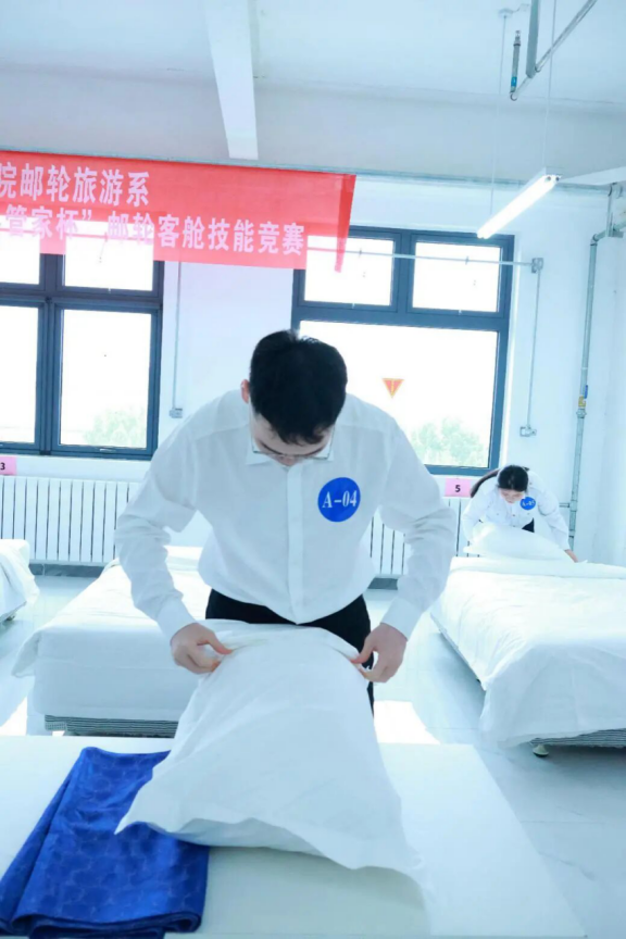 大赛紧扣客舱服务核心技能,设置中式铺床和毛巾花折叠两个赛项。在中式铺床环节,选手们需在规定时间内完成1.2米×2.0米单人床的铺设。从开单、包角到套被罩、铺床旗,每个环节都考验着选手的熟练程度和细节把控能力。赛场上,床单飞舞,动作行云流水,选手们在最短时间内打造出平整紧绷、美观规范的床铺,充分展现了未来邮轮管家的专业素养。