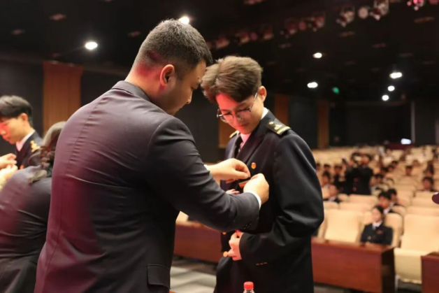 随后举行的胸牌授予仪式上,各系学员代表依次上台,由与会领导、老师为其佩戴青马学员胸牌。这枚标识不仅象征着青马学员的身份,更承载着沉甸甸的责任与使命,激励学员在今后的学习与实践中严于律己、率先垂范。