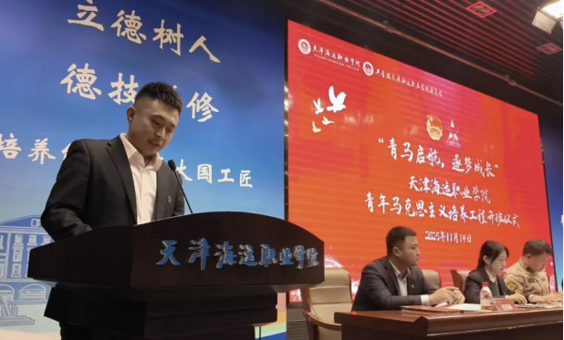 11月14日,天津海运职业学院“青马启航,逐梦成长”青年马克思主义者培养工程(以下简称青马工程)骨干培训班开班仪式举行。学院党委副书记王军、团委书记王洋、青马工程总教官朱涛及各系团委书记出席活动。仪式由团委教师武海瀛主持。