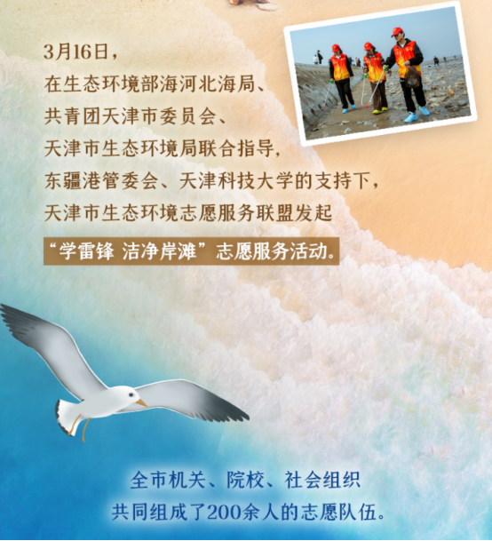3月16日,在生态环境部海河北海局、共青团天津市委员会、天津市生态环境局联合指导东疆港管委会、天津科技大学的支持下,天津市生态环境志愿服务联盟发起“学雷锋 洁净岸滩”志愿服务活动,全市机关、院校、社会组织共同组成了200余人的志愿队伍,天津海运职业学院师生积极参与。津云、天津电视台等对此次活动进行了报道。