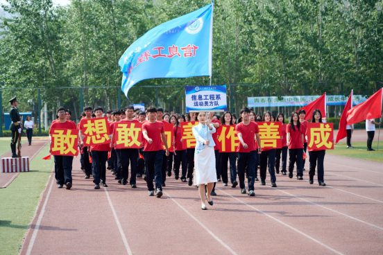 伴随着激昂有力的现场解说,在国旗护卫队的引领下,院旗院徽方队、旗海方队、各系代表队、留学生方队、裁判员及教职工代表方队精神饱满,迈着整齐的步伐,喊着嘹亮的口号,依次入场通过主席台。