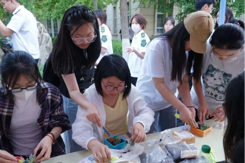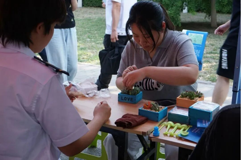 “绿动心舍”DIY多肉微景观活动中,学生亲手种植植物,感受自然疗愈力。学生纷纷表示,要将把作品带回宿舍,在持续照料中体会“以劳健心”的深层意义。