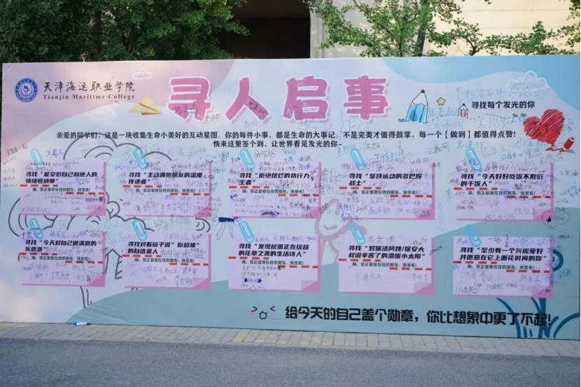 “寻人启事”签名墙,鼓励学生们化身生活的“记录官”与“发现者”,用放大镜捕捉生命的美好瞬间,在寻找自我的过程中收集温暖、积攒自信。