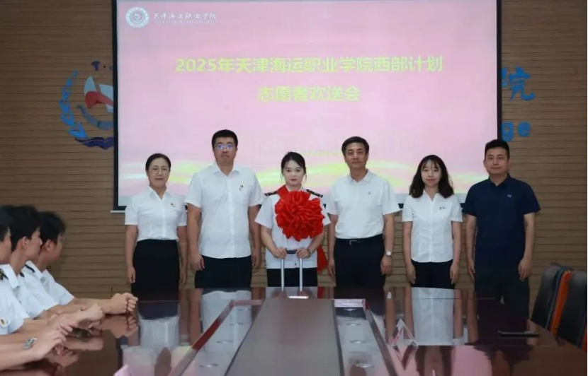 6月26日,天津海运职业学院团委举行2025年西部计划志愿者送行仪式。学院党委副书记王军,工程技术系党支部副书记许裕冬,院团委教师于洁欣、武海瀛,工程技术系辅导员吴立鹏以及团员青年代表一同欢送学院2025年西部计划志愿者刘美静。