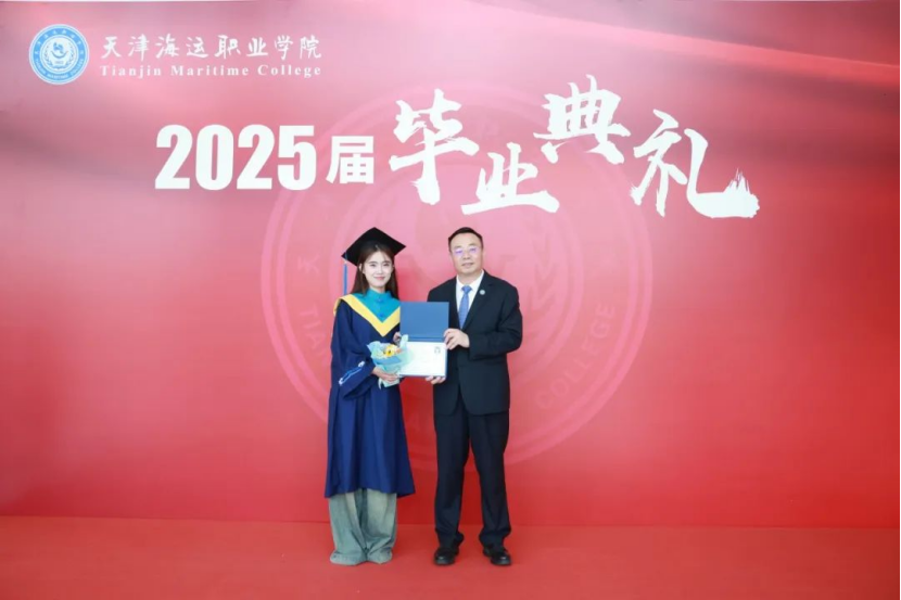 天津市大学生年度人物提名奖获得者、工程技术系理化测试与质检技术(无损检测技术)专业学生王铭鑫,邮轮旅游系旅游管理专业乌兹别克斯坦籍留学生王马克西姆晋平分别代表2025届毕业生、2025届留学生发言,他们细数了三年求学的难忘时刻,表达了对母校及老师的依依不舍和由衷谢意。尤其是王马克西姆晋平同学娓娓道来的“中国缘”“海运情”,以真实而生动的故事展示了学院国际化办学成效,让我们看到了“人类命运共同体”闪亮的青春注脚。